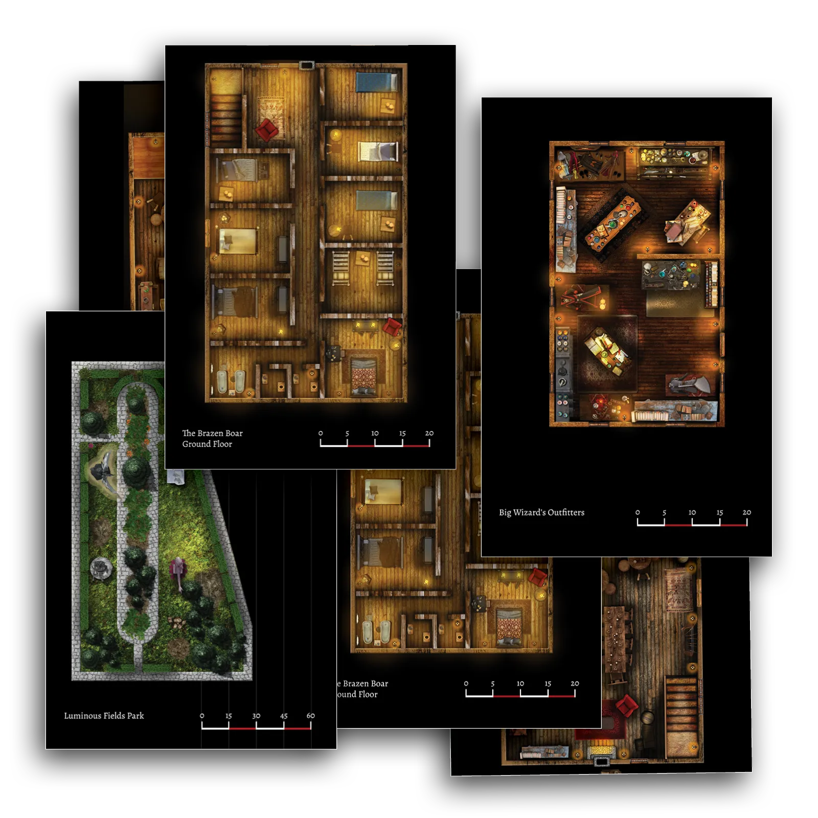 We didn't do ALL of the floorplans for the hundreds of buildings in Darkenhaven as the box would be far too heavy! However, we did include floorplans for important buildings - not only important to us, but members of our community who contributed to this beautiful box set!