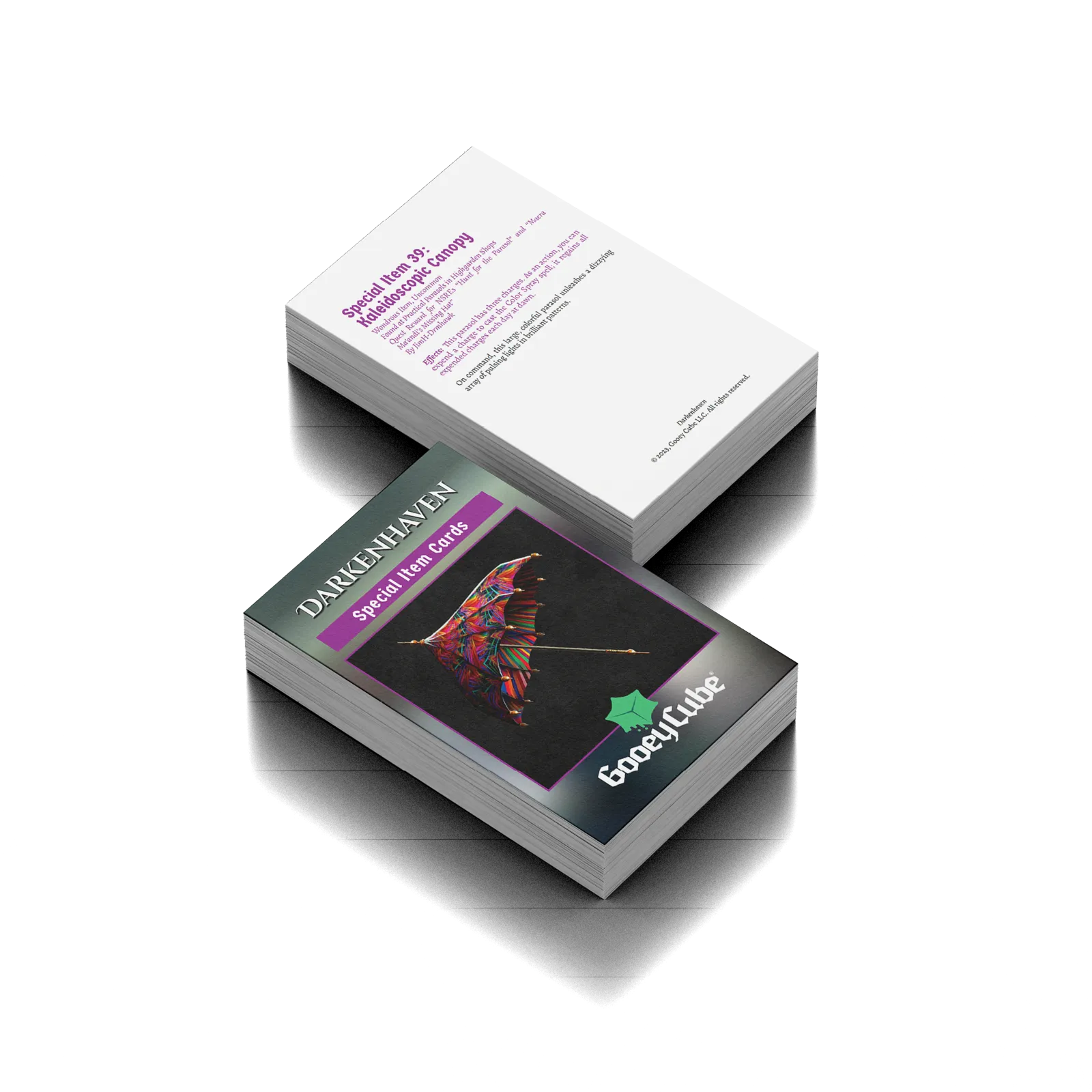 Never worry about a player forgetting what their item does ever again! Every item found is included as an individual item card. On the front is stunning artwork of the item. On the reverse, a detailed explanation of what the item does. From weapons to armor to scrolls to potions, players can keep these cards and refer to them as needed!
