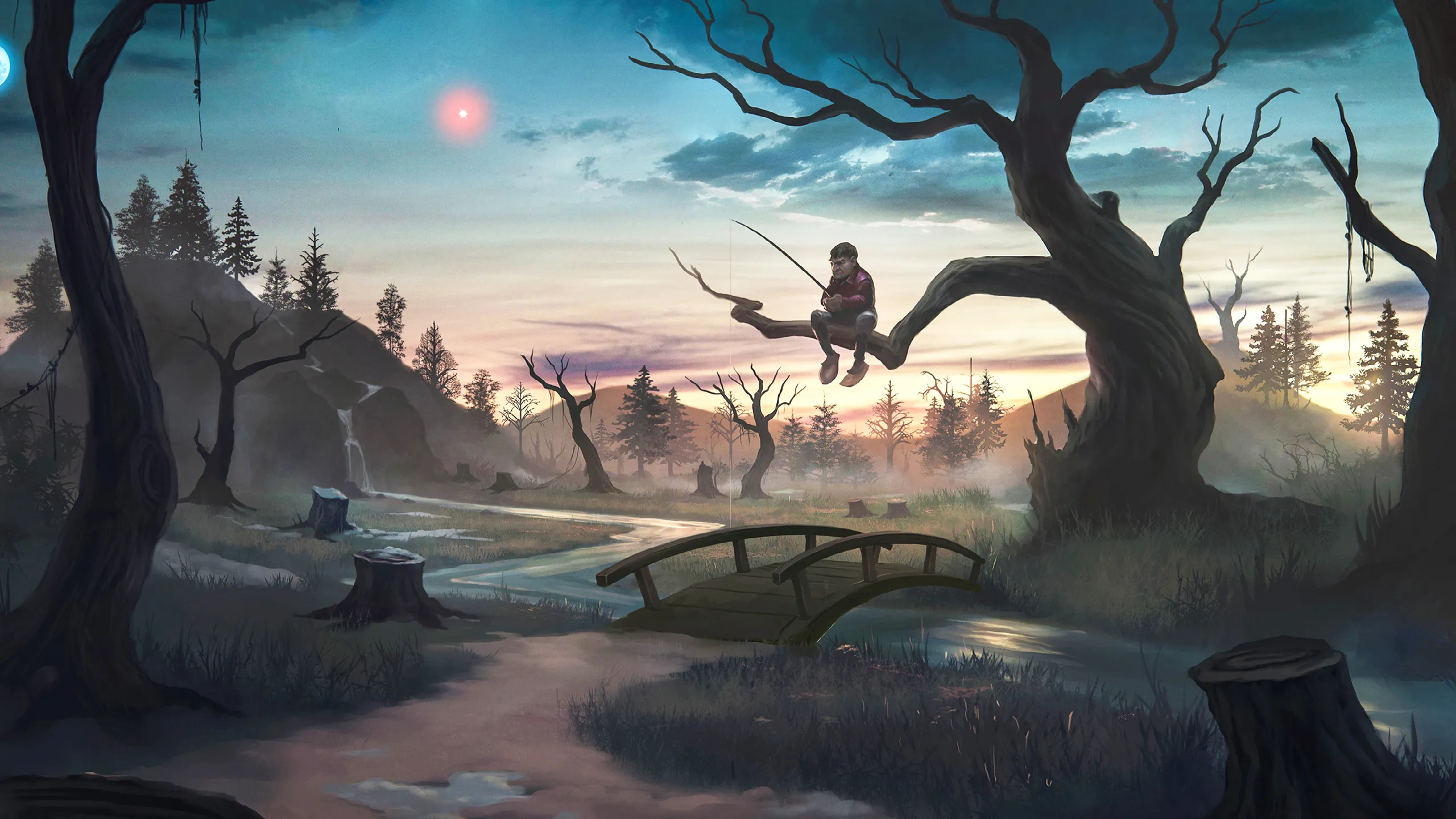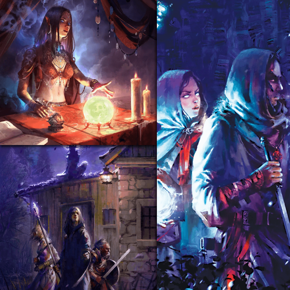 The days loom dark as the wagons roll on toward Prondadol. Nearby, the fetid, stinking Blackrot Bog constantly reminds you of the shadows that lie upon your hearts. In the sky, Zaraghast – the dreaded red star – burns day and night, bringing much fear to you and your fellow members of the Blue Veil. A terrible storm sweeps in. Before it breaks, you will need to make camp; or face the blizzard's fury while on the causeway. There is no option. Though your instincts would have you avoid it, you must pull from the road and set camp at the edge of a small forest that borders the bog. Known as the Mistwood Hollows, it has a fearful and dark reputation. What follows is a fearful and intense journey beneath a shadowy canopy of Dumal-Wood and Shadepine as the snowstorm closes in on the troupe’s location. Quickly after that, the hunters become the hunted, as ghastly creatures track the party...