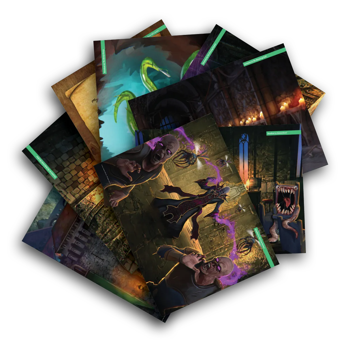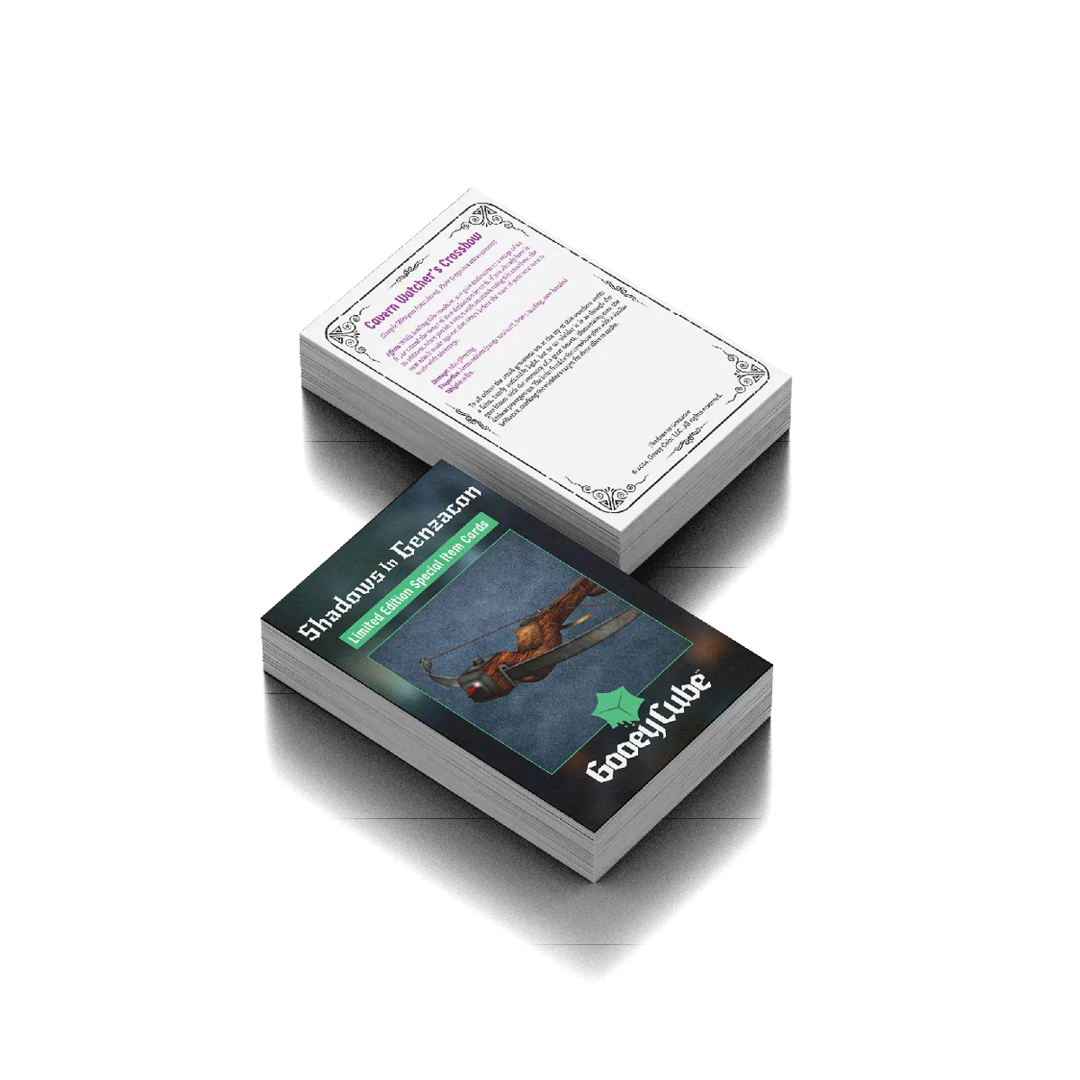Never worry about a player forgetting what their item does ever again! Every item found as part of Shadows of Genzacon is included as an individual item card. On the front is stunning artwork of the item. On the reverse, a detailed explanation of what the item does. From weapons to armor to scrolls to potions, players can keep these cards and refer to them as needed!