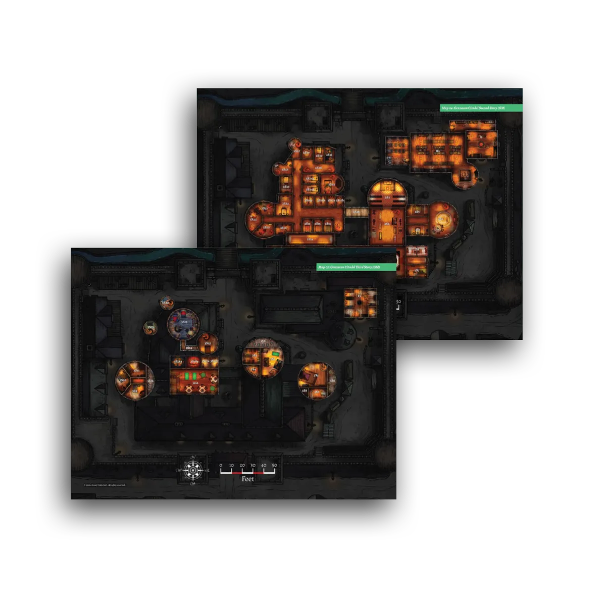 Created by a maestro of map making, every area the Player Characters visit is painted in glorious detail. Two versions of a single map are included; one spoiler-free for the players, and one for the GM. The GM's version is labeled clearly with directions to encounters and areas of interest within the GM Reference Book.