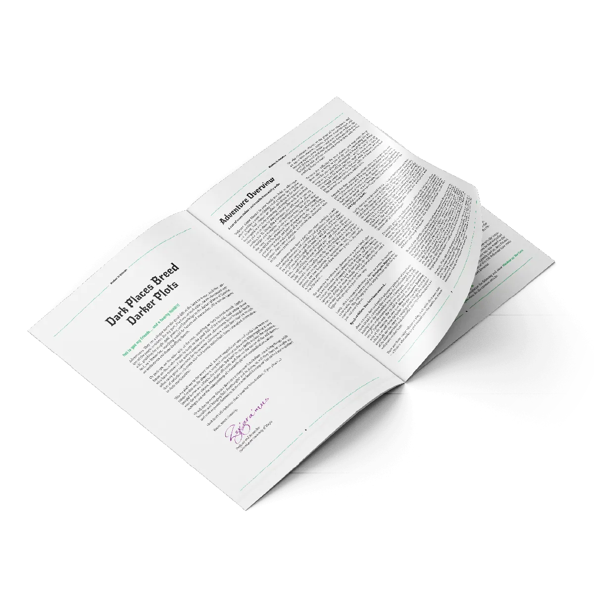 Within the Adventure Book, a riveting tale unfolds in a manner designed to entertain the GM, as well as their players. With passages to read directly to the players distinct from text for the GMs eyes only, and number and color codes directing to handouts and stat blocks, there is very little a GM must do but familiarize themselves with the content, and embellish upon it only if they desire to.