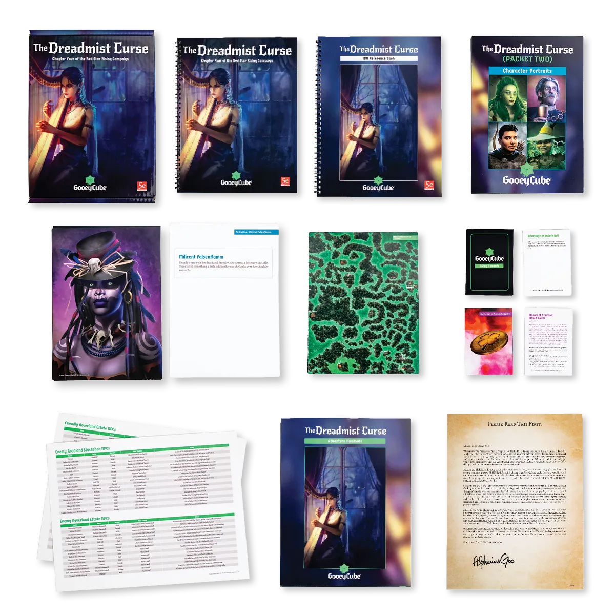 Our mission is to cut down on prep work and save GMs hours of effort. Each chapter comes with everything you need to run an adventure, with an adventure book, GM reference book, pre-generated character sheets, NPC portraits, maps, locality art, item cards, and a set of “gooey rewards.”