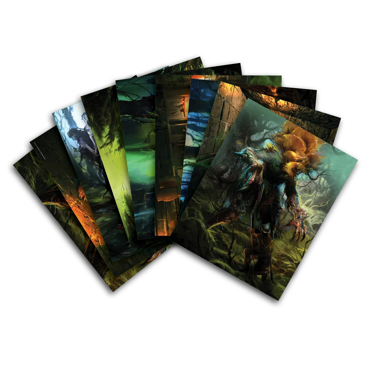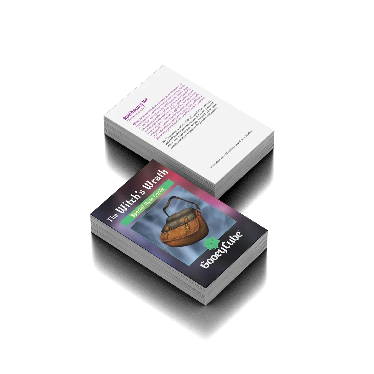 Never worry about a player forgetting what their item does ever again! Every item found as part of The Witch's Wrath is included as an individual item card. On the front is stunning artwork of the item. On the reverse, a detailed explanation of what the item does. From weapons to armor to scrolls to potions, players can keep these cards and refer to them as needed!
