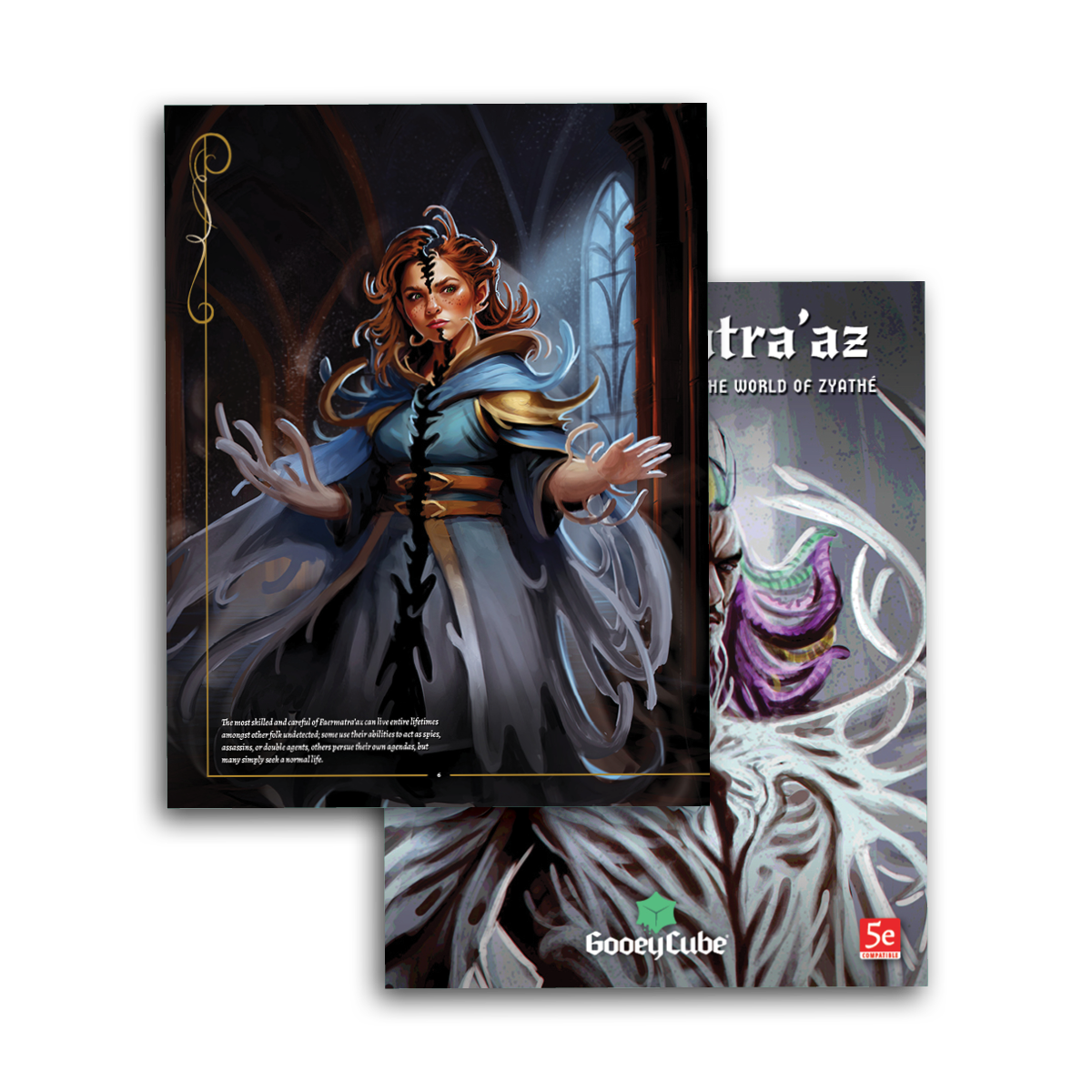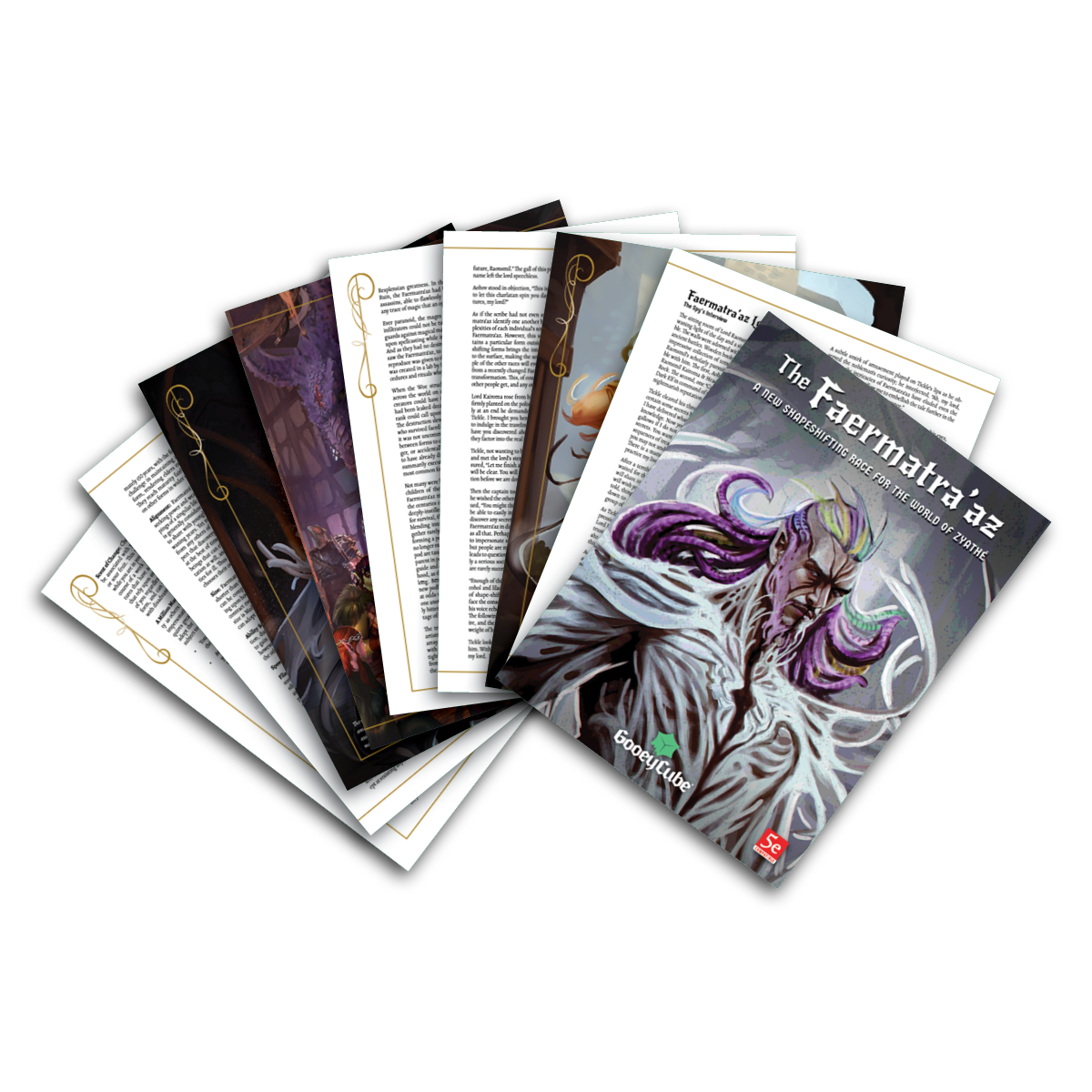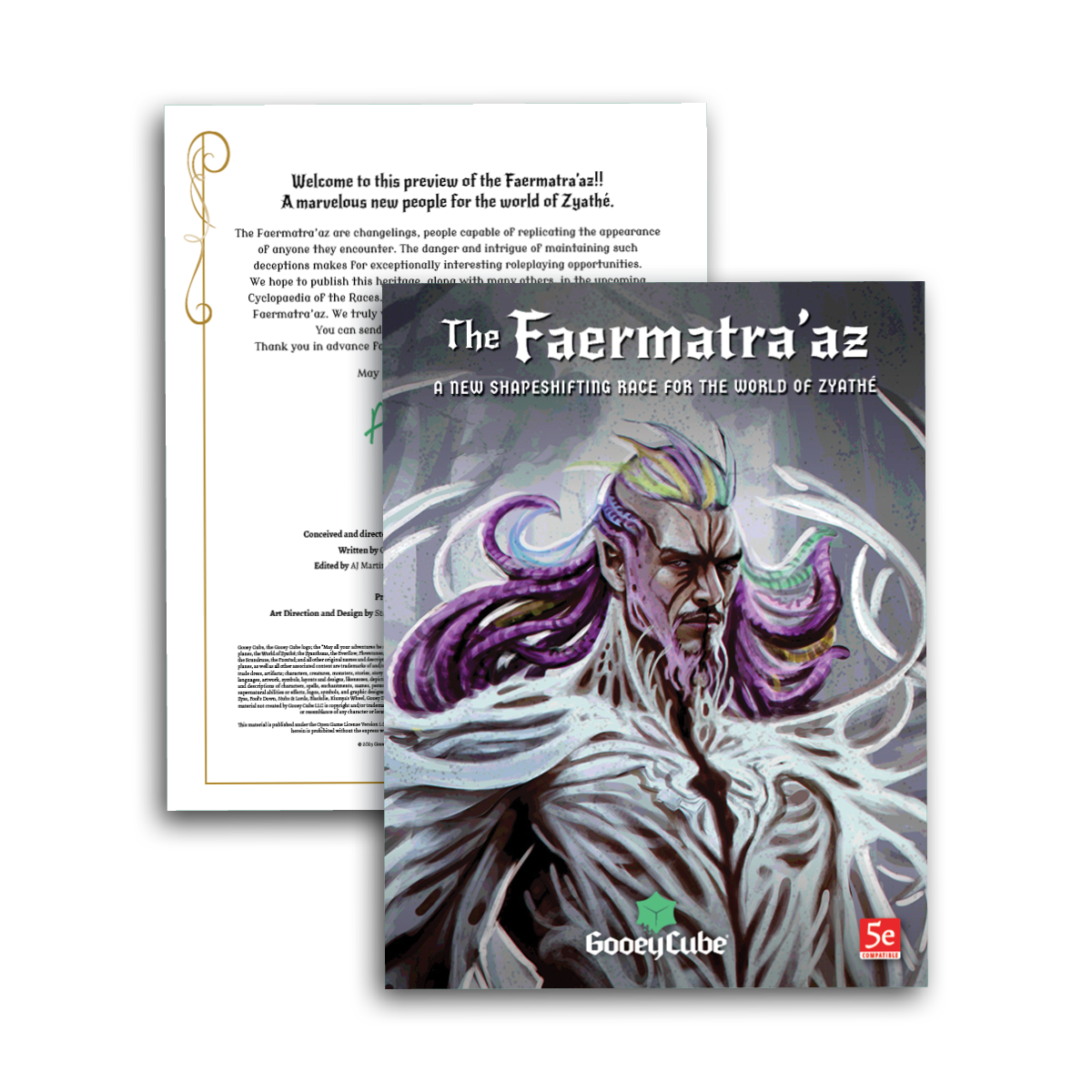 Created using the highest cycles of magic by the toweringly arrogant Archmages of the Ethernic Empire, the Faermatra’az were molded into the ultimate tools for espionage, assassination, and infiltration. Unbeknownst to their creators, the shapshifters eventually became so intelligent and intuitive that they developed into a race of sentient hominids with desires and ambitions of their own. Finally freed when the apocalyptic Woe of Ruin destroyed their creators, the Faermatra’az demonstrated their resourcefulness by developing the means to propagate themselves, building a small yet stable population with a culture of their own. Now they live hidden amongst societies all across Zyathé, using their incredible abilities to hide in plain sight, for ends both fair and foul.
